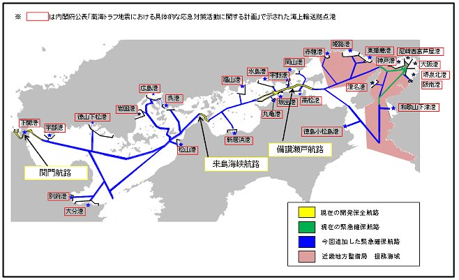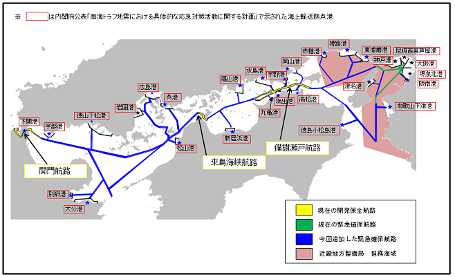 大規模地震などの発生時に、緊急物資を輸送する船舶の通行ルートを確保するため、瀬戸内海の一般海域において国が障害物を迅速に除去できる区域として瀬戸内海に係る緊急確保航路を設定しました。