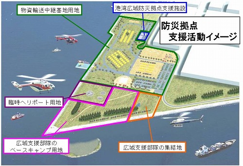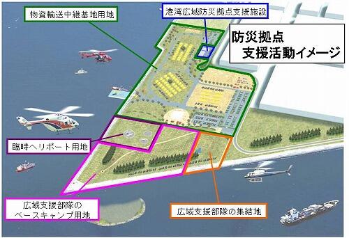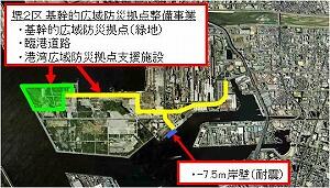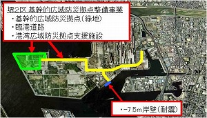 京阪神都市圏における大規模地震発生時の緊急物資の広域輸送や応急復旧活動等の災害対応力の向上を図るため、堺泉北港堺2区において、基幹的広域防災拠点としての高次支援機能を担う緑地、港湾広域防災拠点支援施設、臨港道路及び近接する耐震強化岸壁の整備を推進します。また、平常時は臨海部の立地を活かして、住民が憩える親水性を備えた緑地として利用されます。 なお、堺2区における基幹的広域防災拠点の主な機能は、①緊急物資の中継・分配機能、②広域支援部隊の集結地・ベースキャンプ機能、③応急復旧用資機材等の備蓄機能になります。