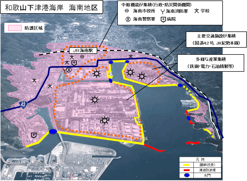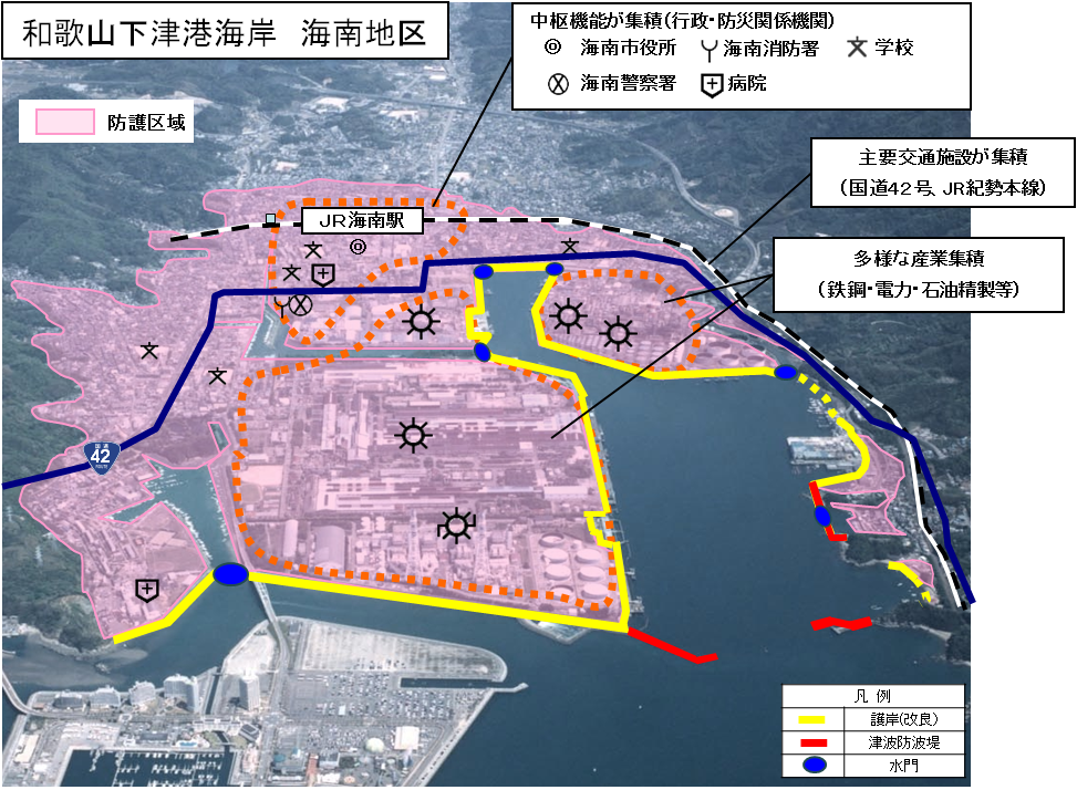 和歌山下津港海岸は、今後30年以内に70%程度の確率で南海トラフで発生する地震に伴う津波の襲来が予測されており、当海岸の背後地域には、行政・防災中枢機能や主要交通施設に加えて、世界的シェアを誇る高付加価値製品の製造企業群が集積しているため、津波来襲時には極めて甚大な被害の発生が危惧されています。