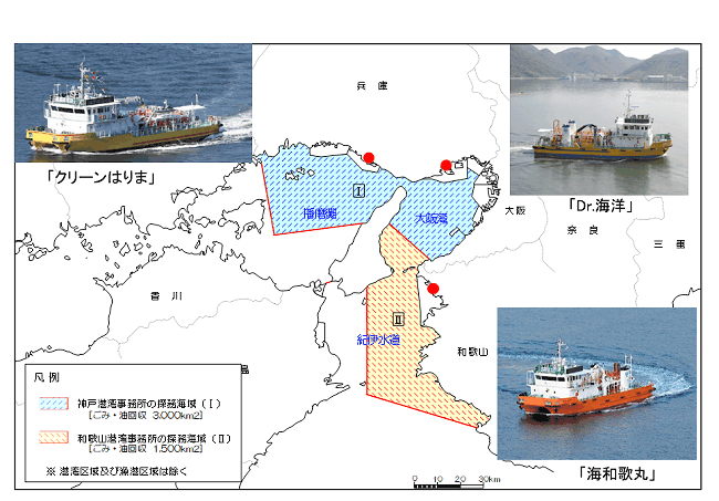 瀬戸内海における航行船舶の安全の確保、海洋の汚染の防除、良質な海洋環境保全を積極的に行うため、大阪湾・紀伊水道・播磨灘 4,500k㎡(大阪湾1,100k㎡、播磨灘1,900k㎡、紀伊水道1,500k㎡) で海面の浮遊ごみ・浮遊油の回収業務を実施し、積極的に海洋環境の保全をめざす。また、非常災害が発生した場合、必要な物資・資材の供給、迅速に航路啓開業務を行う。