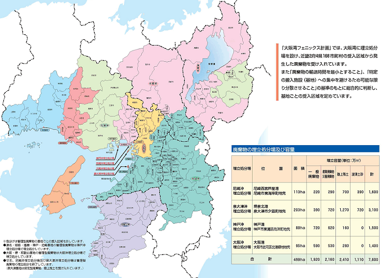「大阪湾フェニックス計画」とは近畿2府4県、168市町村から発生する廃棄物を処分するために、大阪湾に4つの海面埋立処分場を整備するというプラン。第一期計画としては「尼崎沖処分場」「泉大津沖埋立処分場」の2つを、第二期計画として「神戸沖埋立処分場」「大阪沖埋立処分場」の整備を推進しています。