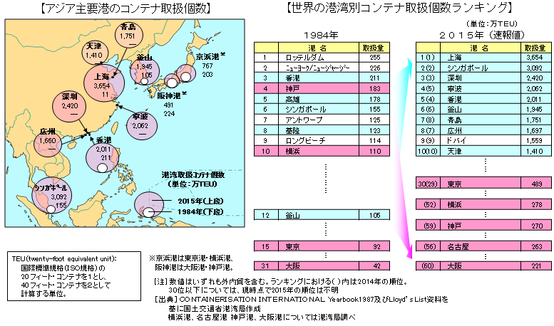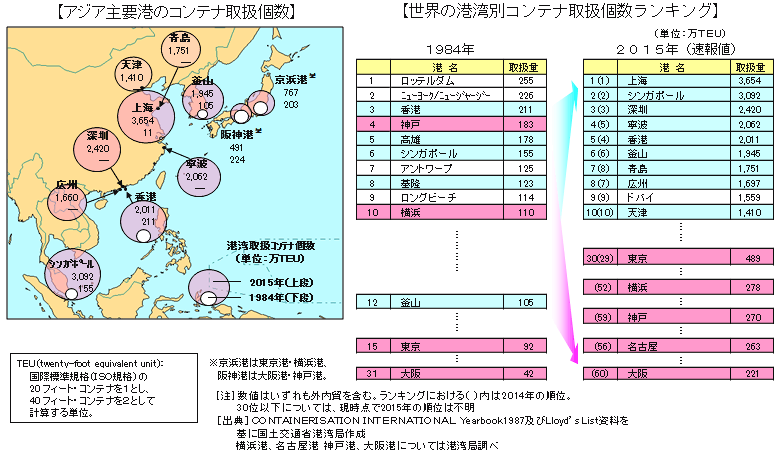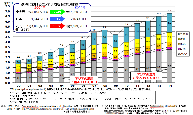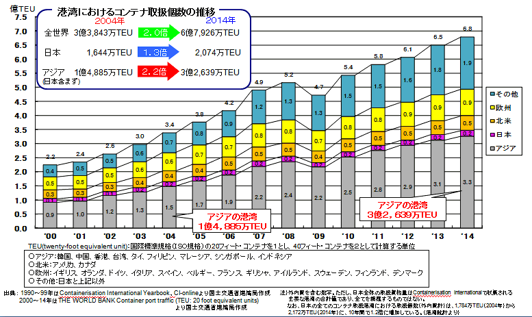 アジア地域(特に中国)の諸港湾のコンテナ取扱量が著しく増大している。