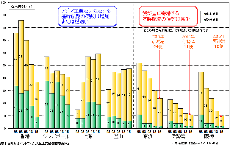 我が国港湾とアジア主要港との欧米基幹航路寄港便数の比較